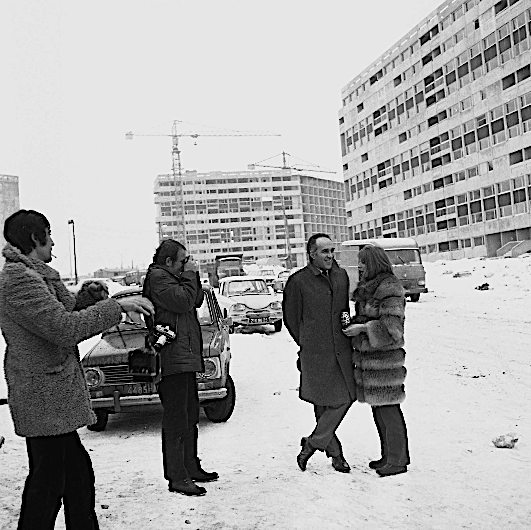Piccoli les pieds dans la neige à Planoise, dix ans avant qu’Anne Vignot découvre également Planoise les pieds dans la neige. © Mémoire Vive/Ville de Besançon.