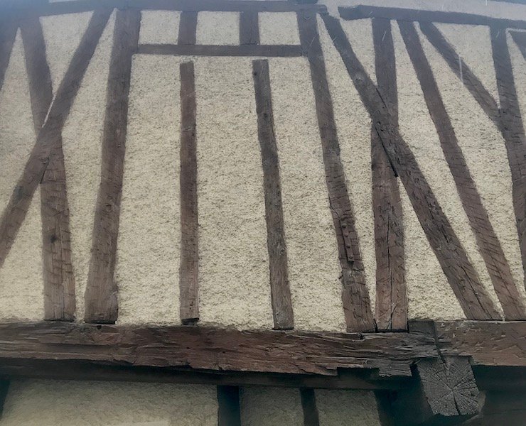 Grimpons ensuite jusqu’en haut de la rue du Grand-Charmont (au 5) pour découvrir un petit bout de façade (fatiguée…) à pans de bois. On redescend ensuite vers la beaucoup plus imposante maison qui marque l’angle des rues du Séchal et du Petit Charmont. Ici, pareillement, les poutres de la façade ont bien-bien subi l’outrage des siècles mais la baraque est toujours debout.
