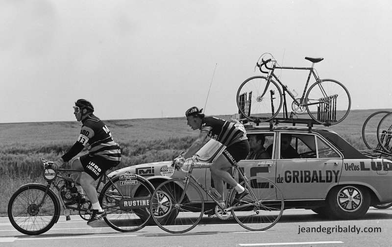 Tout commença aux alentours de 1958 quand Jean décida de reprendre le très célèbre Café de la Bourse pour le transformer en magasin de cycles. « Papa n’était pas certain de son affaire, alors il s’est dit : si le vélo ne marche pas, conservons la licence IV, il vaut mieux garder une poire pour la soif ». A cette époque, l’ancien café reconverti en temple du vélo est tout en profondeur. Quelques années plus tard, en 1962, un incendie le détruit en partie. Il est restauré et, sous l’impulsion alternée des tantes de Christian, il prospère. Son atout maître n’est pas là. Jean de Gribaldy a été un fameux cycliste qu’on a vu escalader le Tourmalet et l’Isoard aux côtés de Coppi, de Bobet et de Robic. Jusqu’à ce qu’il se casse la clavicule et mette un terme à sa carrière. « Dès qu’il s’est arrêté de courir, Papa a eu envie de rester dans le milieu. Il a monté une équipe régionale amateur, puis semi professionnelle ».