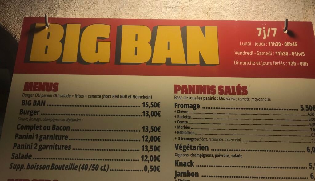 À chaque fois, en faisant le pied de grue sur le trottoir, la réflexion nous vient que pas mal des client(e)s du Big Ban étaient loin d’être né(e)s quand la première enseigne sous ce nom a ouvert, à l’orée des Eighties, trois ans à peine après l’installation en France du premier fast food de l’autre clown (même si Jacques Borel et Wimpy avaient initié le mouvement dès 1961). De la race des pionniers donc, le Big Ban. Et toujours là aujourd’hui. Et toujours digne représentant d’une street food au sens premier du terme : ni salle donc, ni tables, ni chaises, juste une cuisine ouverte sur la rue. Tu commandes puis tu te poses sur un des bancs du quai Veil-Picard ou de la place du 8 Septembre. Tu as aussi le droit de d’affaler sur ton canap, si ton appart n’est pas trop loin. La carte fait le tour de tout ou presque ce qui se mange avec les doigts : du frenchy jambon beurre au ricain hot dog, de la mitraillette de chez les Belges (un Américain, quoi) au panini come in Italia. Et des burgers, of course, plutôt maousses et qui font le job : viandes locales, sauces maison… D’accord, les prix ont (comme partout, de fait) pas mal grimpé, les suppléments peuvent parfois faire tiquer (avant, en un quart de seconde, de craquer pour le morbier…). Comme les horaires sont élastiques, le Big Ban est la terre promise des estomacs trop vite creusés par un boulot démarré très tôt ou chavirés après un apéro à rallonge. On y vient donc à toute heure. Et on y revient comme certain(e)s Bisontin(e)s exilé(e)s sous d’autres cieux qui évoquent, comme un pèlerinage, un passage au Big Ban à chacun de leur retour en ville…