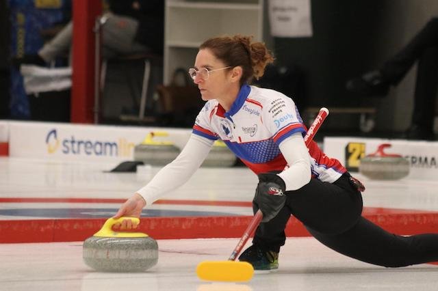 Comme on est pour la parité (comme le curling où les épreuves sont souvent mixtes), Stéphanie Barbarin au lancer. © Besançon Curling Club.