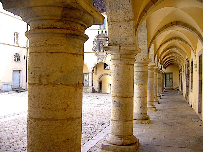 À ce stade, tu as maintenant marché une petite demi-heure et te voilà toujours officiellement au long de la Nationale 5 mais, comme ici on l’appelle grande-rue, au cœur de la ville historique. Une ville parmi les plus puissantes de Franche-Comté au Moyen-Âge, alors surmontée d’un château et entourée de fortifications dont ne restent aujourd’hui que quelques ruines hormis la toujours fièrement dressée tour de la Sergenterie (XVIe siècle). Sinon, au long de cette grande-rue, on a renoncé à compter le nombre de bâtiments de caractère que tu va croiser : hôtels particuliers, discret kiosque à musique dans un mini square, classieux hôtel de ville du XVIIe…