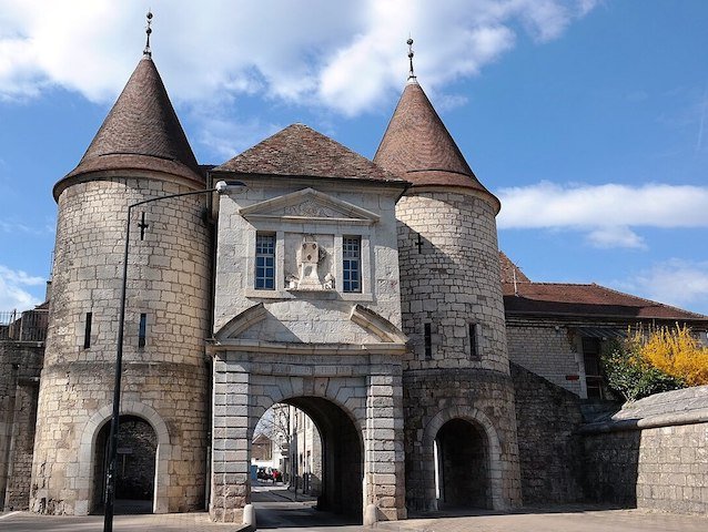 Pour garder le passage entre Doubs et rocher de la Citadelle, la porte Rivotte a été aménagée dans la muraille de la ville au XIIIe siècle. Vraisemblablement. En tous cas, le premier écrit à évoquer cette porte date de 1255. Mais on doit à Charles Quint donc à la première moitié du XVIe siècle ce qui fait aujourd’hui le pittoresque de la porte Rivotte : avec ces deux tours, percées de meurtrières et coiffées de toitures coniques. Bon, comme on est à Besançon, il fallait s’attendre à croiser Vauban à Rivotte. Le Sébastien (de son prénom) conserve la porte Rivotte mais y ajoute un avant-corps (partie d’un bâtiment qui dépasse un chouia de la façade, pour t’éviter d’ouvrir un dico) qu’il fait orner de quelques symboles, sans équivoque après la conquête de la Franche-Comté, dont le soleil du roi du même surnom, Louis XIV. Bizarrement, l’astre rayonnant est toujours là, alors que les Révolutionnaires ont destroyé comme il faut fleurs de lys et couronne sculptées juste en dessous. La porte Rivotte survit (à la différence de toutes les autres de la ville, hormis la porte Taillée) au passage des siècles même si elle change de gueule en 1893 : pont-levis comme herse sont détruits, le fossé comblé et deux passages sont percés dans les tours, histoire de permettre le passage des piétons. Qui devaient toutefois parfois s’aventurer sous le porche central, au risque de se faire piétiner par un cheval si l’on en croit l’inscription gravée sur le fronton pour inciter cavaliers et voitures à chevaux à ralentir l’allure :   » Défense expresse de trotter «