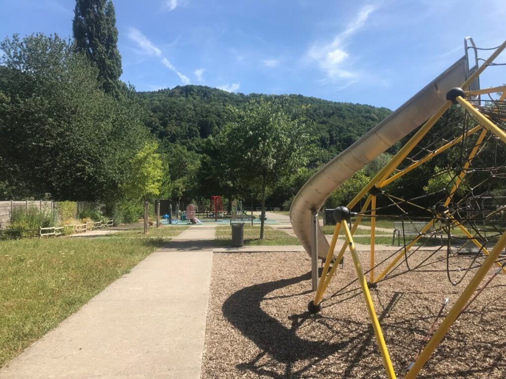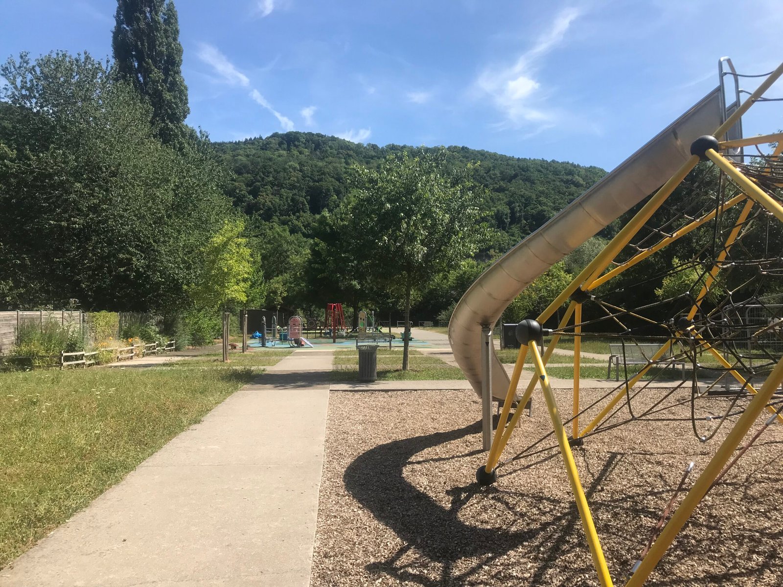 Besançon compte une bonne soixantaine d’aire de jeux. Pour être tout à fait francs, il n’est  pas, dans l’immédiat, inscrit au programme de l’équipe de La Cédille d’emmener notre autre équipe (de mômes) les tester toutes. Mais l’aire de jeux de Velotte était, elle, inscrite tout en haut de ce programme. D’abord parce que même si notre sac ne s’était pas alourdi d’un mètre d’arpenteur, c’est, sans conteste, la plus vaste de la ville ; le parc de Velotte, aménagé sur une ancienne friche agricole, fait déjà lui dans les presque trois hectares. Ensuite, parce que cette aire de jeux s’inscrit dans un environnement à la cool, dans un quartier tranquille avec moult frondaisons à l’horizon.